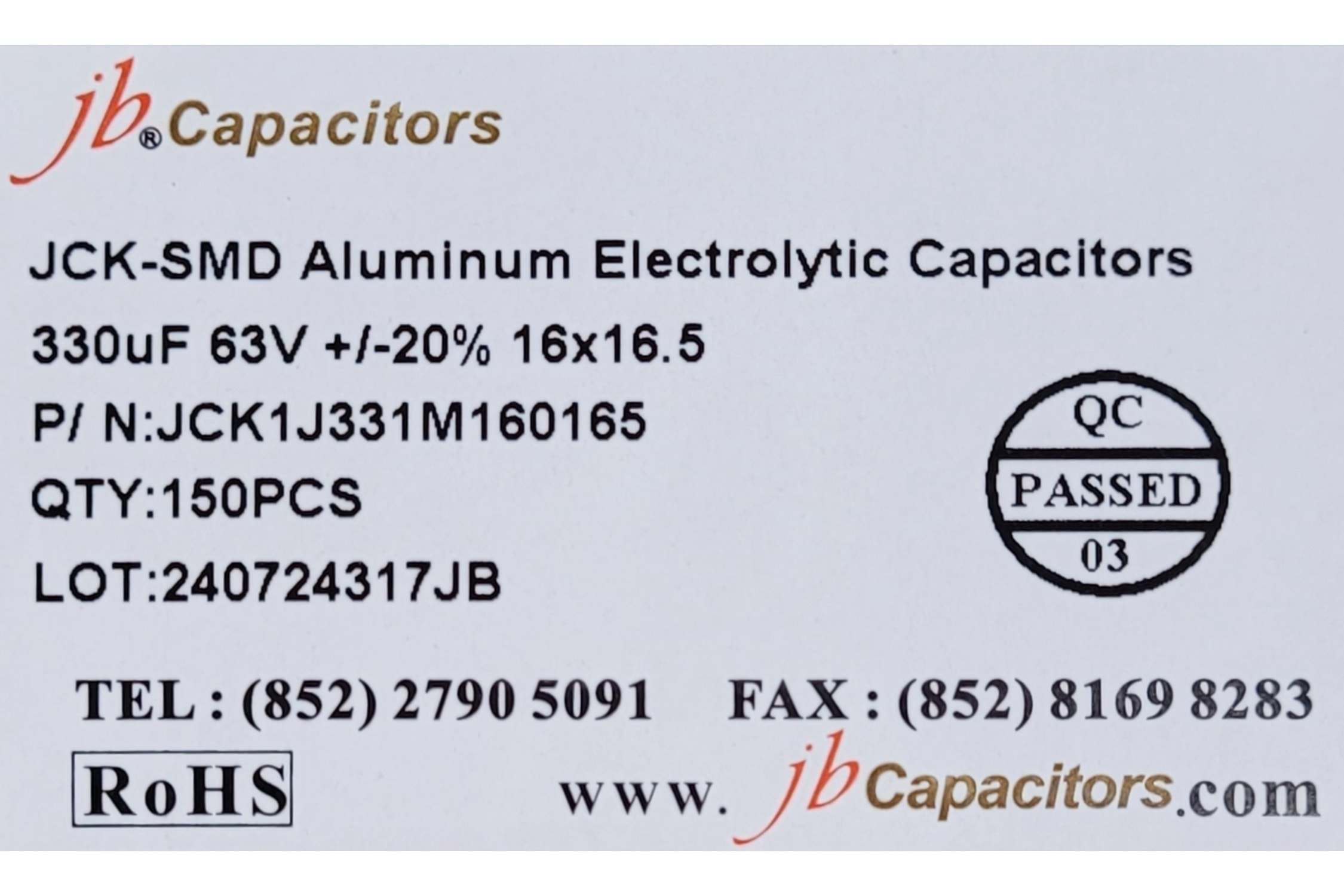 JCK1J331M160165 - 330uF 63V +/-20% 16*16.5mm 105' T/R RoHS SMD Aluminum Electrolytic Capacitors